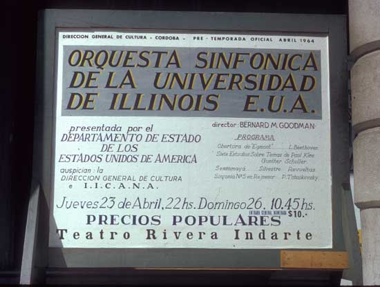 from El Nacional, Caracas, Venezuela, March 6, 1964, by Israel Peña (excerpt).—"Polish, precision, clearness of tone, magnificant union in the blending of the notes of the various instruments, accomplished with no forced effort, rendition from the almost inaudible pianissimo to fierce, strident cacaphony; all those and many other qualities of a great symphony orchestra we felt present and alive as something organic, yet artistic, in the University of Illinois Symphony Orchestra under the baton of its conductor Bernard M. Goodman."